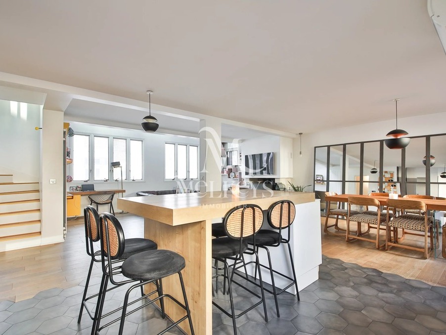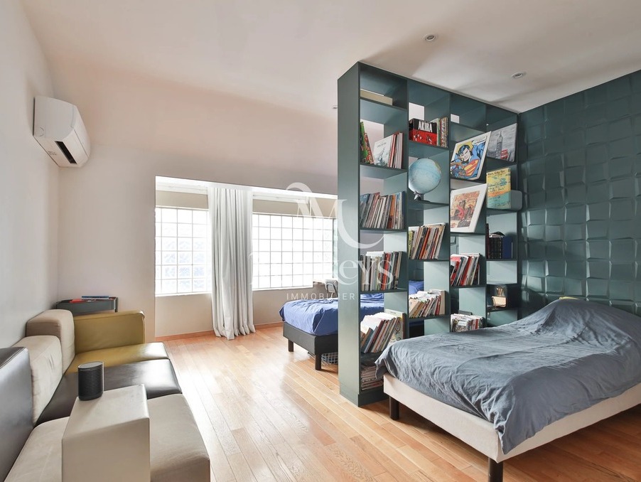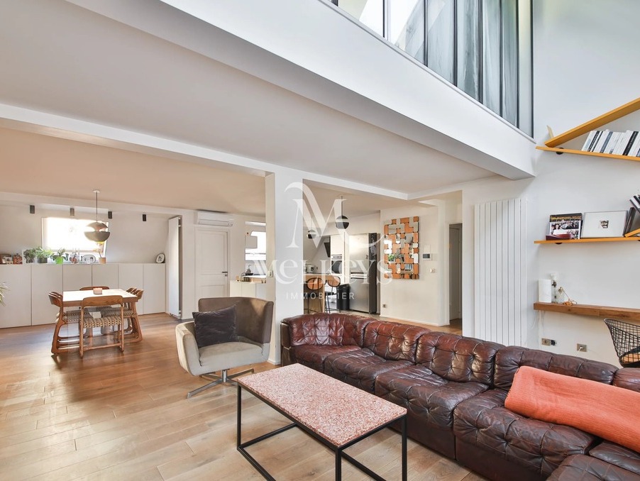 Accessible par ascenseur privatif, le 3ème étage s'ouvre sur une triple réception cathédrale totalisant près de 60 m²: un salon convivial avec cheminée sublimé par une hauteur sous plafond de plus de 6 mètres, une salle a manger, une cuisine ouverte aménagée et équipée et des toilettes. Le niveau inférieur desservi par un escalier en bois, accueille trois chambres confortables, une grande salle de bains, des toilettes séparées ainsi qu’un dressing intégrant une buanderie. À l’étage supérieur, une suite parentale traversante offre un véritable cocon avec verrière sur le séjour, rangements intégrés et salle de douche privative avec toilettes. Une cave vient compléter ce bien rare à la vente, alliant calme, luminosité et prestations de qualité.